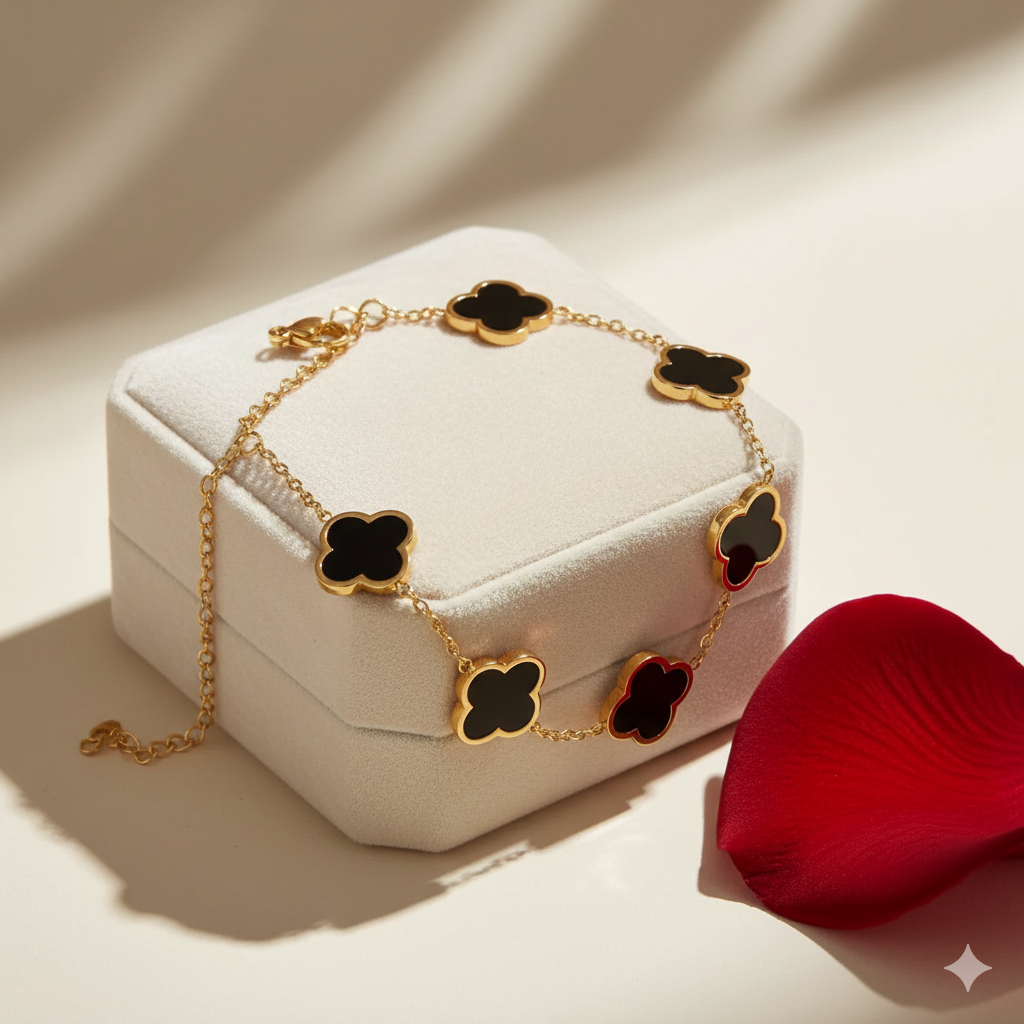 Timeless Charm: Features five iconic four-leaf clover charms with a striking black enamel inlay, symbolizing luck and elegance.
